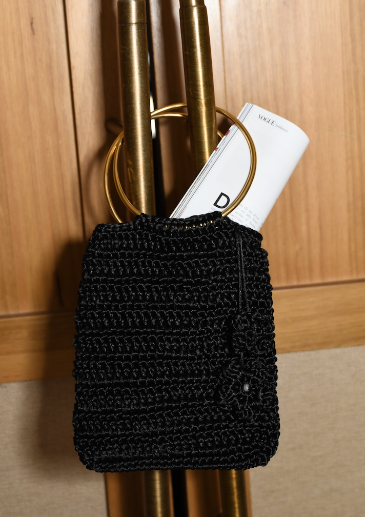 Cartera elegante y moderna con aro metálico protagonista que eleva el diseño y le da un toque sofisticado y chic. Disponible en dorado o negro, es el complemento perfecto para looks tanto de día como de noche.